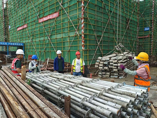 來(lái)到3樓頂板上方,工人們正搭建防護(hù)網(wǎng)。“他們是這個(gè)工作面的開(kāi)荒者,危險(xiǎn)系數(shù)最大。”葉劉杰說(shuō),只有防護(hù)網(wǎng)搭建完畢,木工、鋼筋工等不同班組才能陸續(xù)入場(chǎng)施工。仔細(xì)查看每道工序,并對(duì)當(dāng)班工人叮囑一番注意事項(xiàng)后,葉劉杰才放心離開(kāi)。