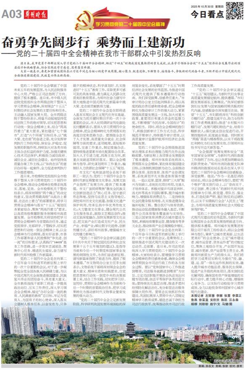 黨的二十屆四中全會(huì)擘畫了中國(guó)式現(xiàn)代化建設(shè)的宏偉藍(lán)圖,為新時(shí)代新征程國(guó)有企業(yè)改革發(fā)展指明前進(jìn)方向、提供根本遵循,鄭州城發(fā)集團(tuán)廣大黨員干部群眾深受鼓舞、倍感振奮。近日,《鄭州日?qǐng)?bào)》《鄭州晚報(bào)》開設(shè)了【學(xué)習(xí)貫徹黨的二十屆四中全會(huì)精神】專欄,2025年10月30日,報(bào)道了鄭州城發(fā)集團(tuán)深入學(xué)習(xí)貫徹落實(shí)黨的二十屆四中全會(huì)精神,以全會(huì)精神為指引真抓實(shí)干創(chuàng)未來。