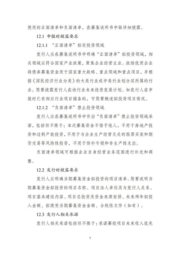 (二)申報材料應明確債券募集資金禁止投向領域,形成“負面清單”。“負面清單”包括但不限于:將募集資金借予他人,用于房地產投資和過剩產能投資,用于與企業(yè)生產經營無關的股票買賣和期貨交易等風險性投資,用于彌補虧損和非生產性支出。“負面清單”領域可根據(jù)企業(yè)自身經營業(yè)務范圍進行補充和調整。